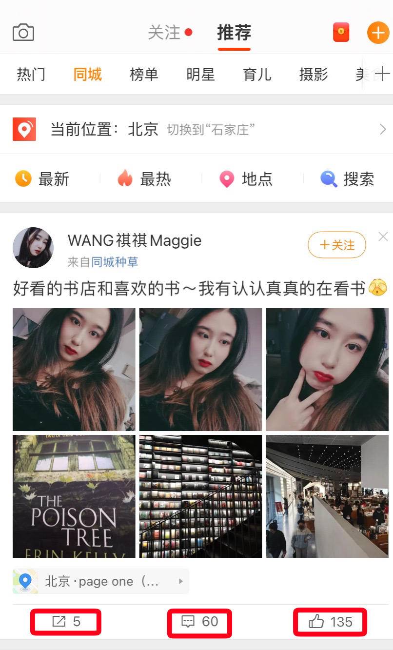 3、上热门需要有一定数量的真人转赞评,其中转发和点赞尤为重要,高质量的转发和点赞可以大幅度提升博文的热度,排名自然而然也会上去。每个城市能够上本地热门的转赞评也是不一样的,比如一线城市北上广深,使用微博的人多,竞争大,那自然转赞评数量要比普通的二三线城市要多,才可以脱颖而出。 看下面的三张截图,有发现不同吧,分为是北京、上海和我的所在地石家庄。同样是本地热门,可是转赞评的数量也是有很大差别的。